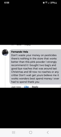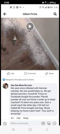 xxxc this product is for people that have tried all kind of poisons from the stores or have paid fumigators 100' of $'s and the situation just gets worse !this is especially for little roaches, bed bugs, fleas silverfish, ants,we also have another treatment very effective for flies this is for people that have paid fumigators over and over again and the situation just keeps getting worse with the little roaches this will get rid of the infestation in about 5 days or less one application can last up to 2 years or more it does not smell bad you don't have to leave your home it is pet friendly 2 baggies x$45 will cover a one bedroom home apartment trailer 3 baggies x$55 can cover up to three bedrooms inside Normal area 7 bags x $100 is for bigger areas or to apply indoors and Outdoors located in San Benito Texas we also sent through regular mail we have some available in San Antonio and Houston Texasxxxxx##$$