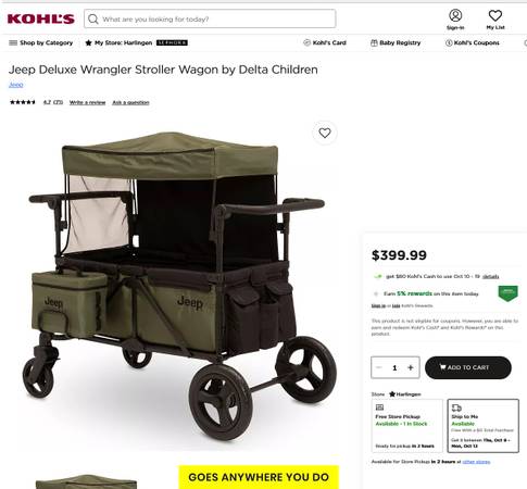 This Deluxe Wagon is like new. It's only been used a couple of times.Includes: Attachment for Infant Car Seat, Cooler Bag ,Canopy for two with all around Mosquito Net/Sun Shade, and Cup holder. Holds up to 110 lbs. (55 lbs. per seat). Age range 0+ . Wagon weighs 46.6 lbs.This Deluxe version of the Jeep Stroller Wagon is much more rugged and quality constructed than the regular version is.\\\\$278////