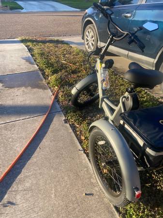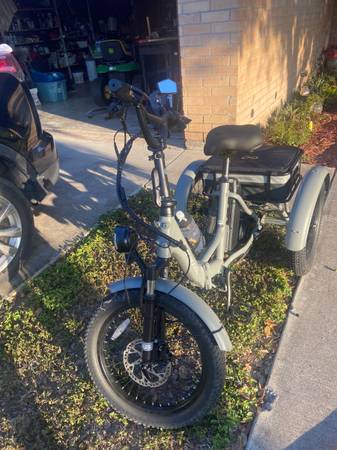 20" - tire width is 3.0'. Adult Electric Trike Tricycle 750W 14.5AH Lithium Battery - run time is 35-60 miles, - 6to 8 hrs charging time . Comes with front a back Insulated basket. almost New used 2 times. Goes up to 16 MPH., has lights, signal lights and horn. Asking $1000.00 Dave show contact info